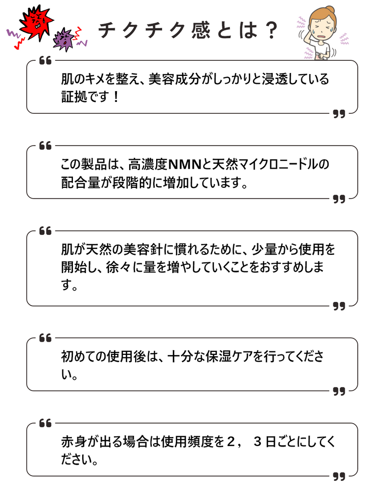 チクチク感やピリピリ感: 使用中にチクチクやピリピリとした感覚がありますが、天然の成分が原因で問題ありません。